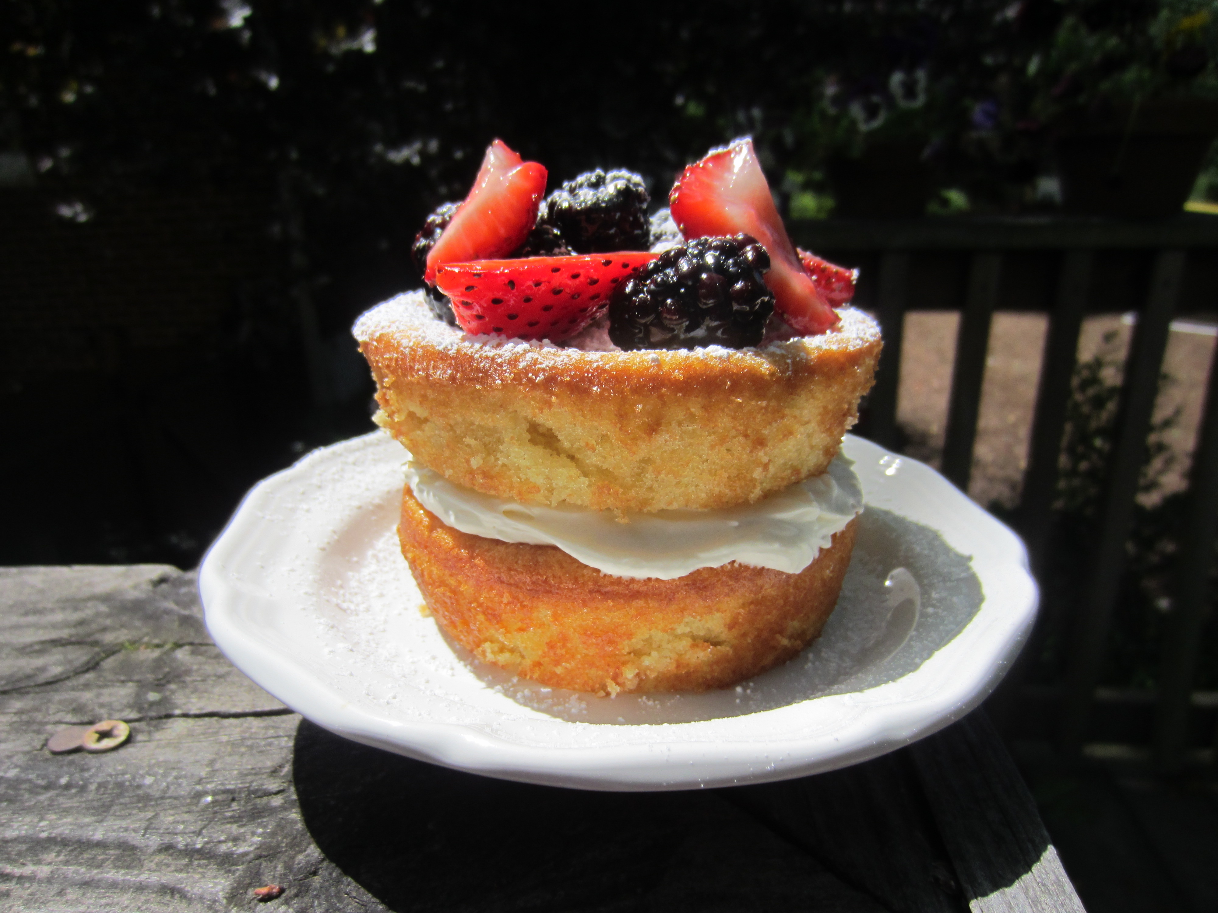 Halve cake horizontally with a long serrated knife. Carefully remove top half and reserve. Put bottom half on a plate, then spread evenly with all of cream and replace top half. Serve with berries. Dust with sifted confectioners sugar.