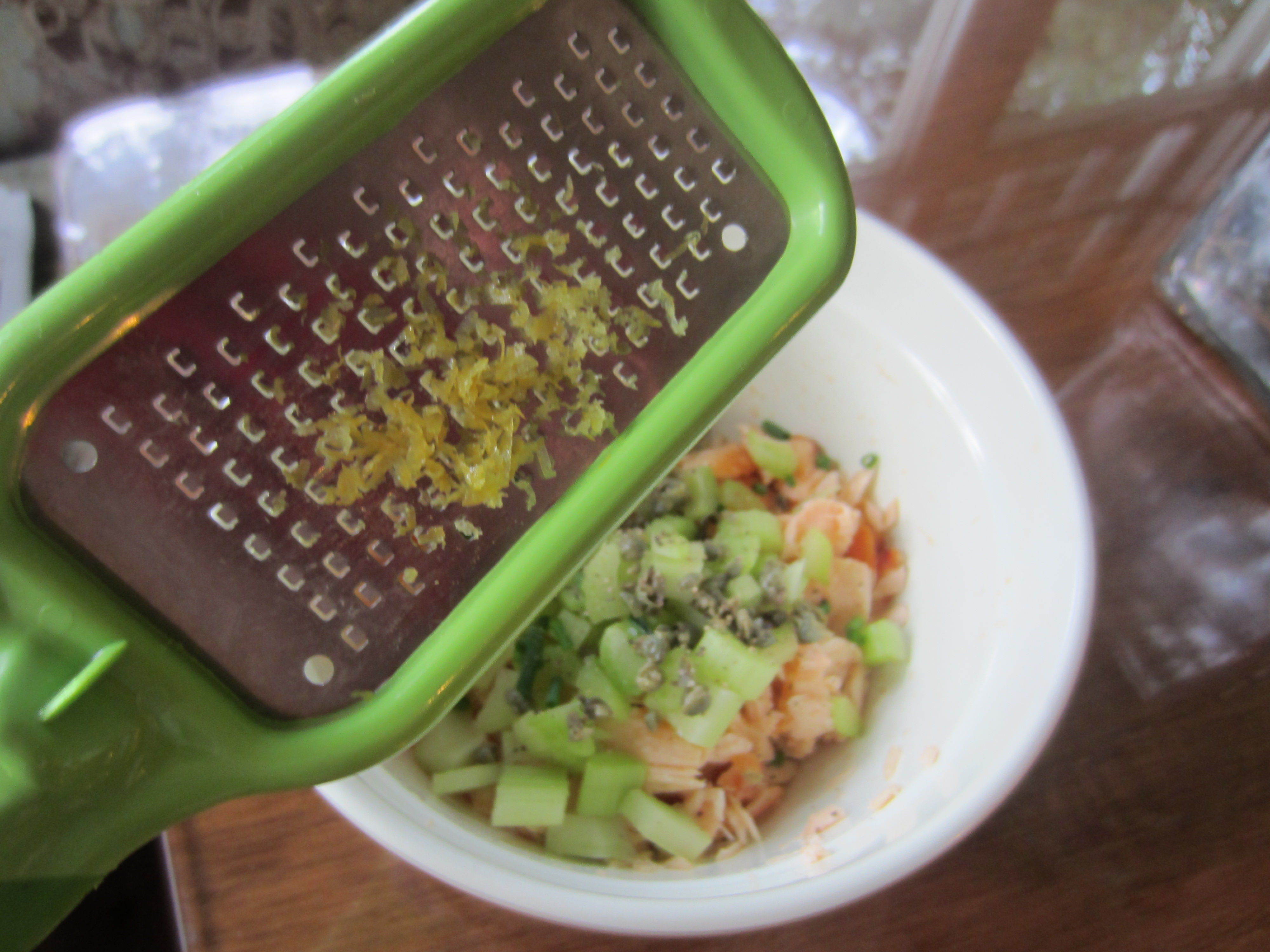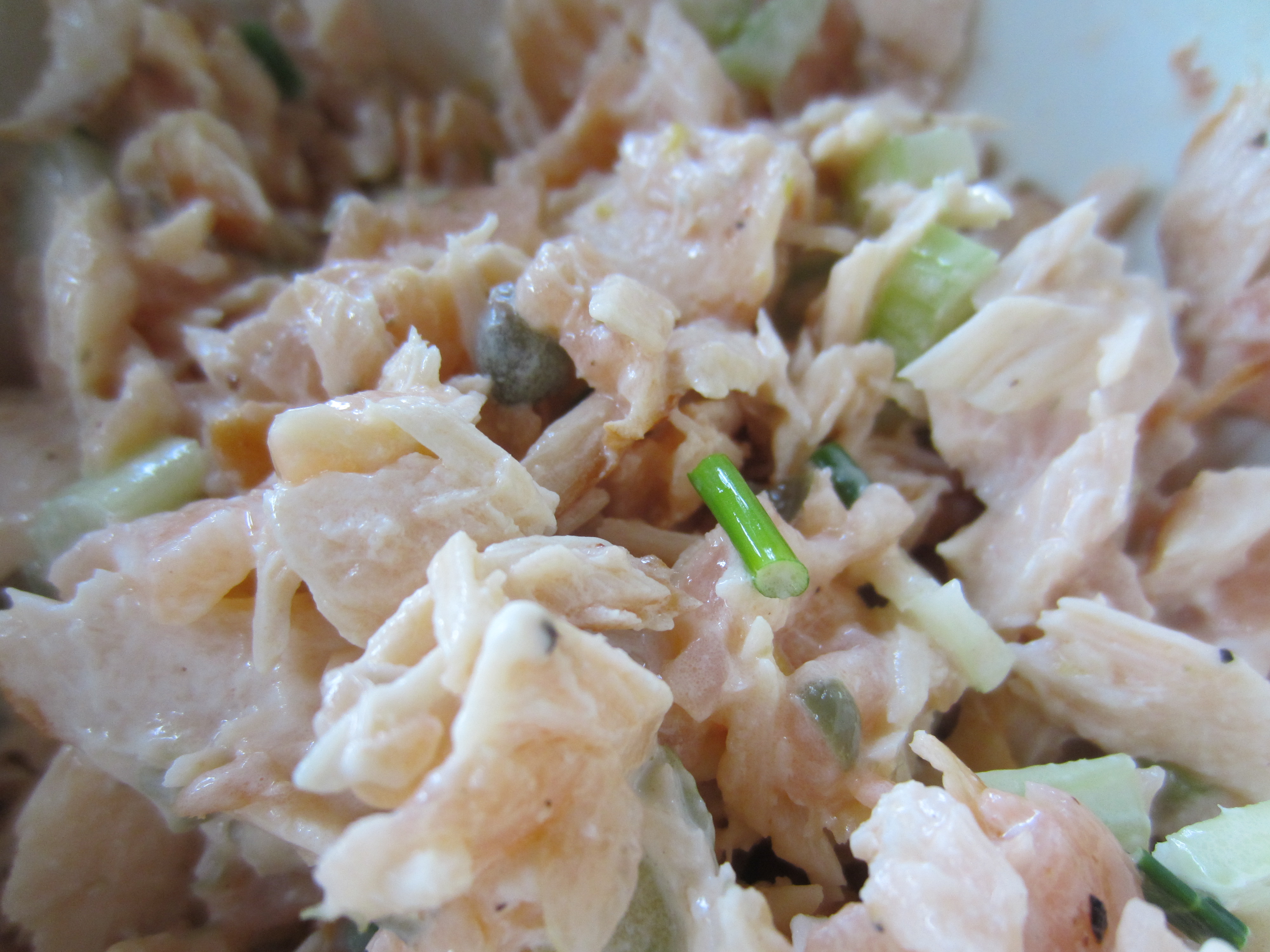 Broil the fillet on an upper rack for 4 minutes on one side, then flip over and broil for 3 minutes on the other side. Cool, then flake with a fork into a medium bowl. Add all the ingredients up to the pepper and gently fold until all the ingredients are well incorporated (I just used my hands).