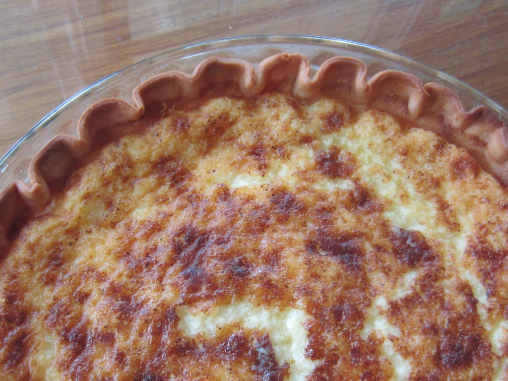 Preheat the oven to 425 degrees. Whisk together the eggs, flour, and sugar. Add buttermilk and butter alternately. Mix in vanilla extract. Pour the mixture into the chilled crust and sprinkle generously with nutmeg. Bake for 15 minutes, then lower the oven’s temperature to 325 degrees and cover the pie with aluminum foil. Bake for another 45 to 50 minutes (the original recipe says 35 to 40, but mine took longer to set). Let cool, then serve at room temperature.