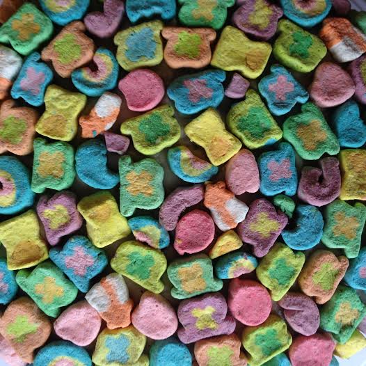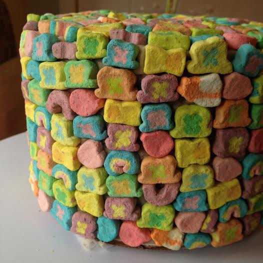 this cake is a crowd-pleaser, and i’d recommend making it if you have a lot of time on your hands. the process of picking all the marshmallows out of the kibble-like cereal requires punctilious patience, as does sticking them onto the cake in a way that no two of the same are touching. i thrive on that sort of compulsive activity, but it’s not for everyone!