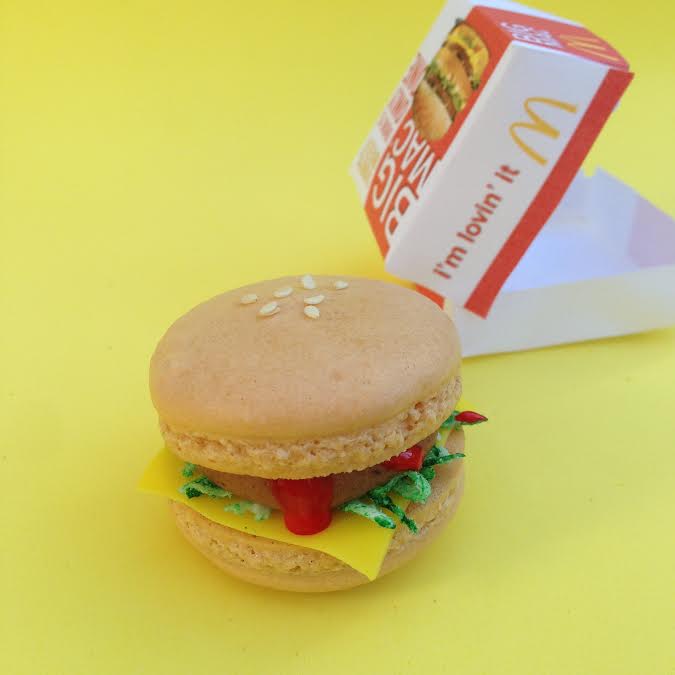 i used a basic macaron recipe tinted with cocoa powder for the bun, topped it with a slice of fondant cheese and some dyed green coconut lettuce, then piped on a chocolate ganache patty and red icing ketchup. a few sesame seeds complete the look!
