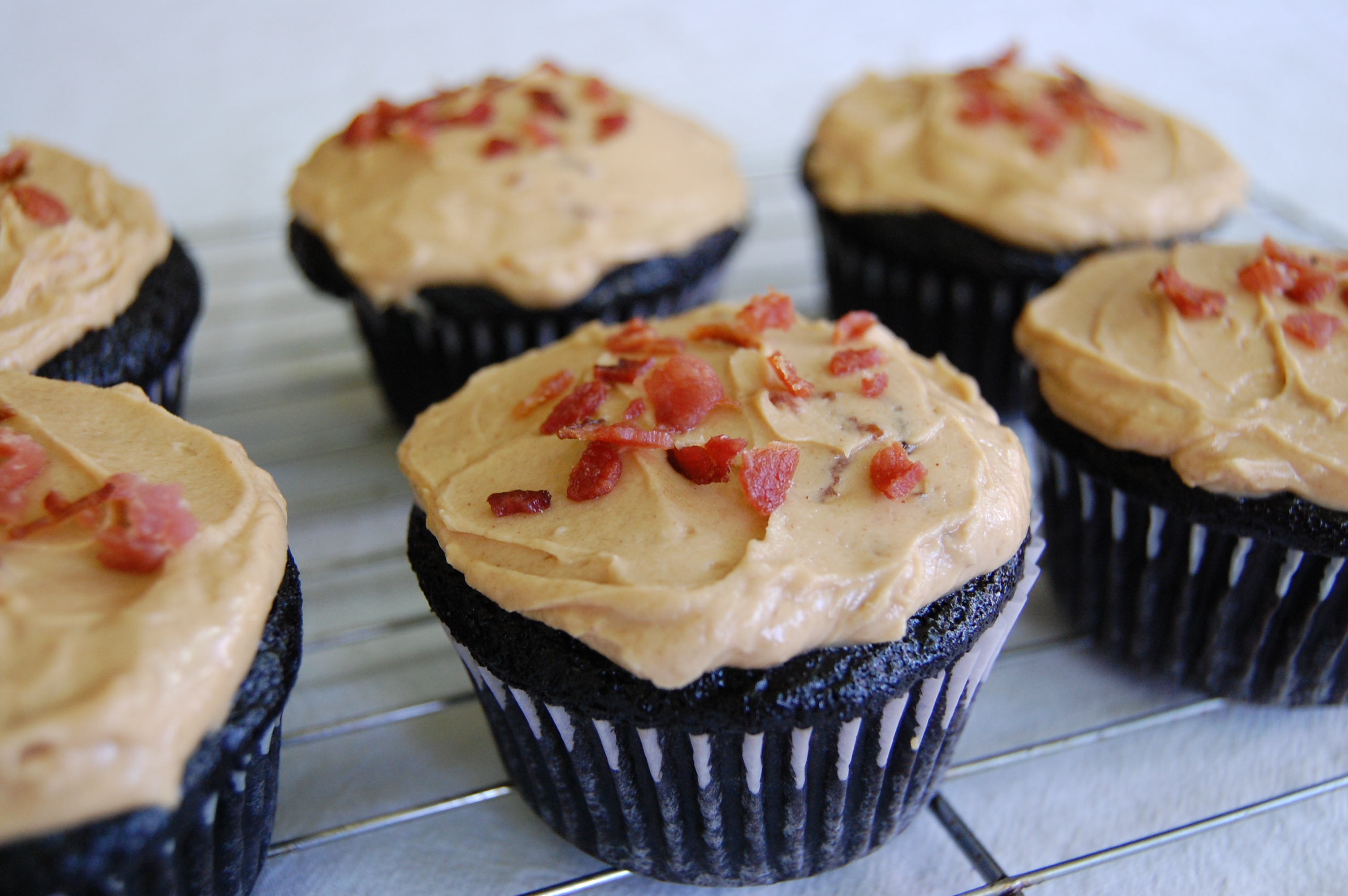 so today, i was planning on making ‘elvis’ cupcakes – peanut butter and bacon frosting on a BANANA base – but a flashback to cy’s reaction reminded me that banana-haters do exist, and maybe they want a recipe with peanut butter and bacon sans the banana.