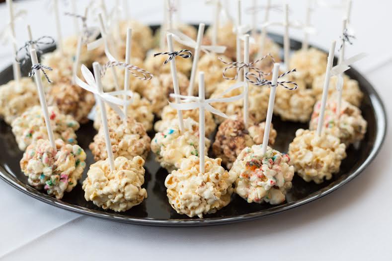 line a baking sheet with parchment paper and put the popcorn into a large bowl. melt the marshmallows and the butter together in a saucepan over medium heat, stirring until smooth. stir in the salt and vanilla. pour the mixture over the popcorn, stirring until evenly coated. let cool for a minute (so the mix-ins don’t melt), then add in a few handfuls of sprinkles/chocolate chips/etc. spray your hands with nonstick spray, then form baseball sized balls. place on the baking sheet. stick a lollipop stick into each one, and adorn with a twine bow, if desired.