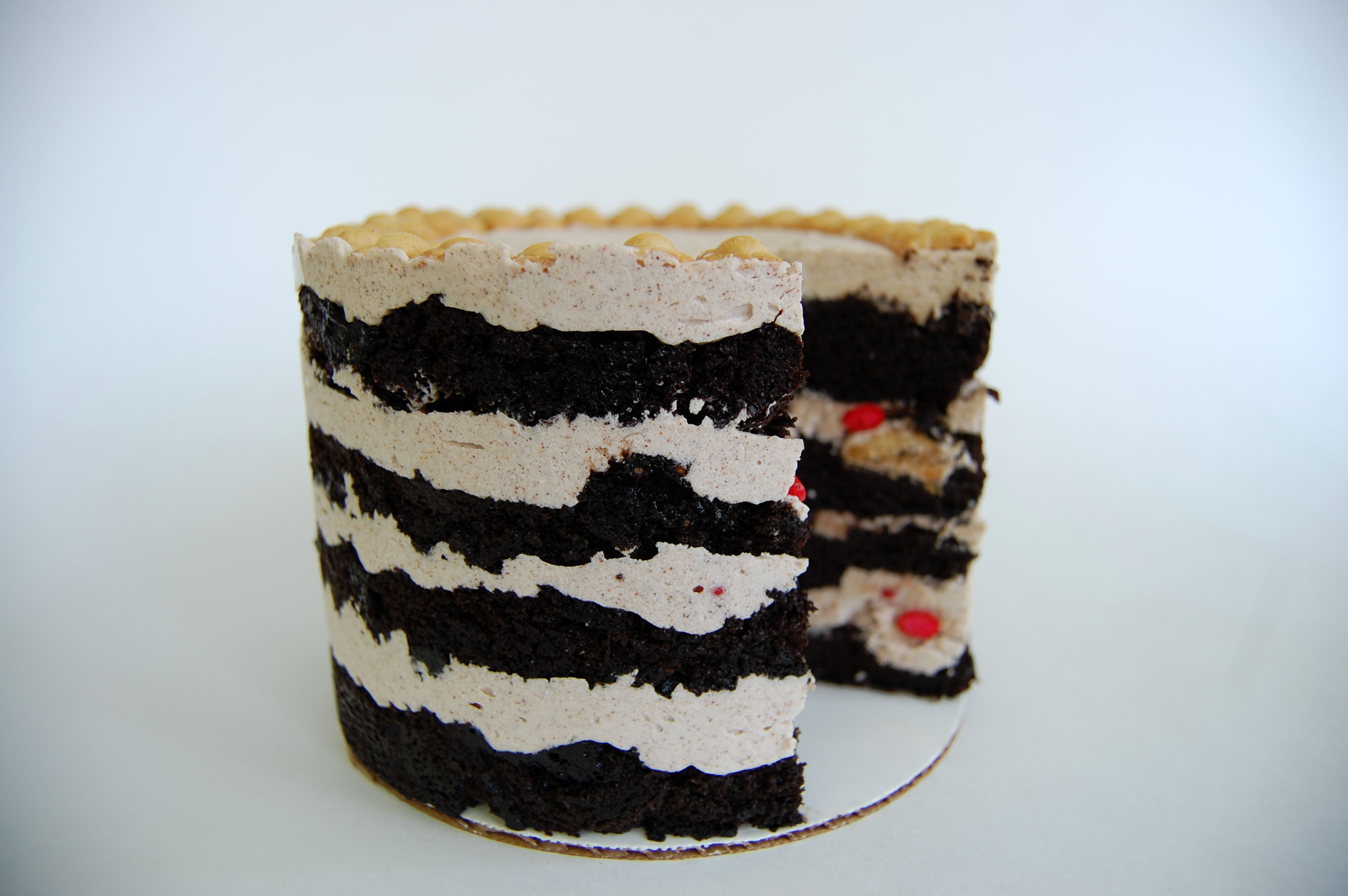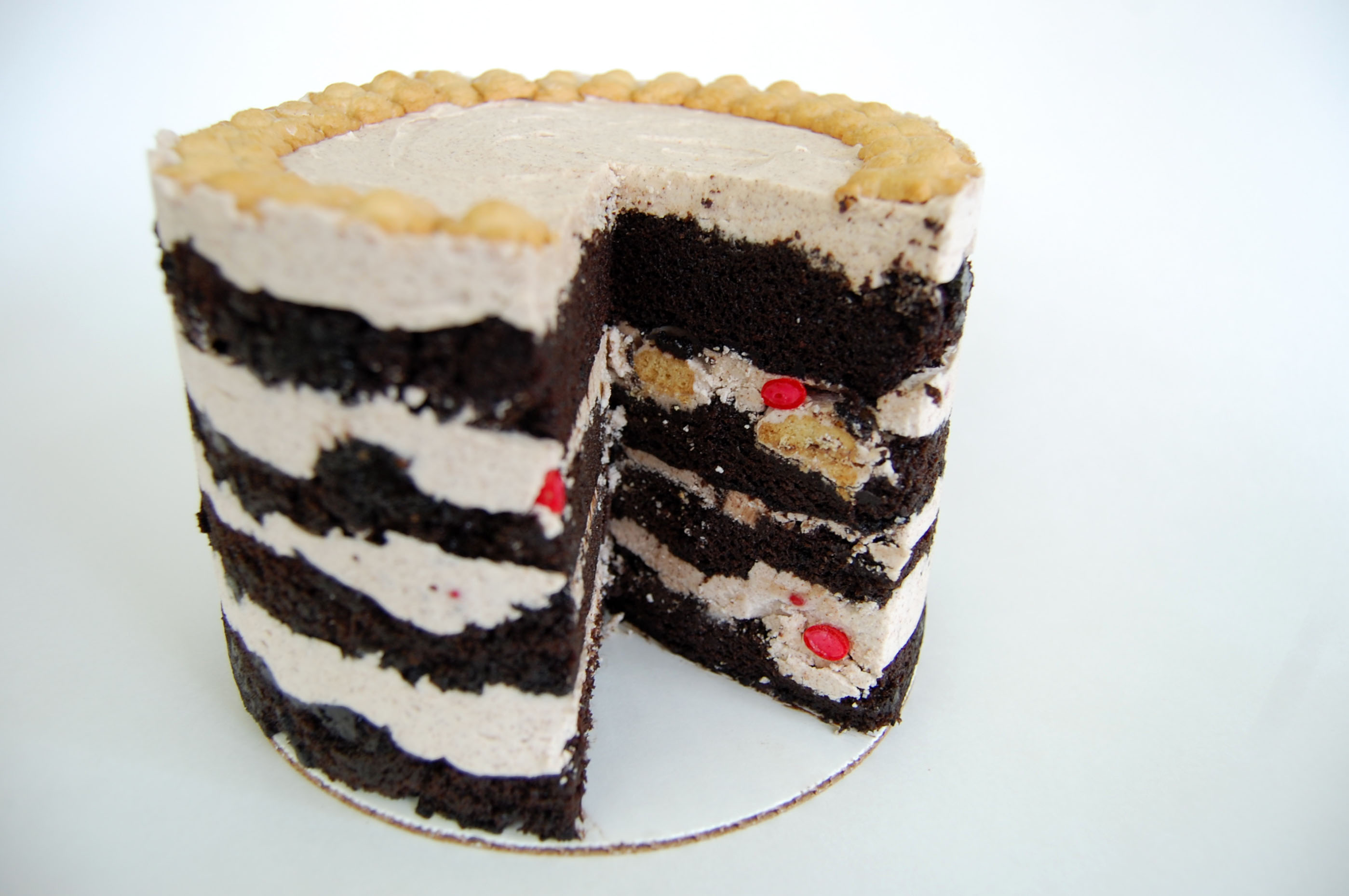 to assemble, use a 6-inch cake ring to cut out rounds from the cake – cut out one whole circle, and make the rest semi-circles. you can push together scraps later to make them whole. cut out a 6-inch circle of cardboard. place your cake ring on top of it. line the inside with a 5×20 inch strip of acetate. place one semi-circle into the ring and add enough scraps to make a complete circle. drizzle on a little bit of the soak (not too much, or it will be soggy). use a bent spoon or an offset spatula to spread a quarter of the frosting on top, and sprinkle on some teddy grahams and red hots. smooth again so that the grahams and candies are mixed into the frosting. repeat the process two more times: cake, soak, frosting, mix-ins, smooth. add your last layer of cake to the top, and don’t soak it. smooth on the remaining frosting. i used the teddy grahams to create a border, but you could decorate with candies, fancy piping, or a dusting of cocoa powder! freeze the cake for at least 12 hours before removing the ring and acetate. serve cold or at room temperature, with coffee or an iced mocha.