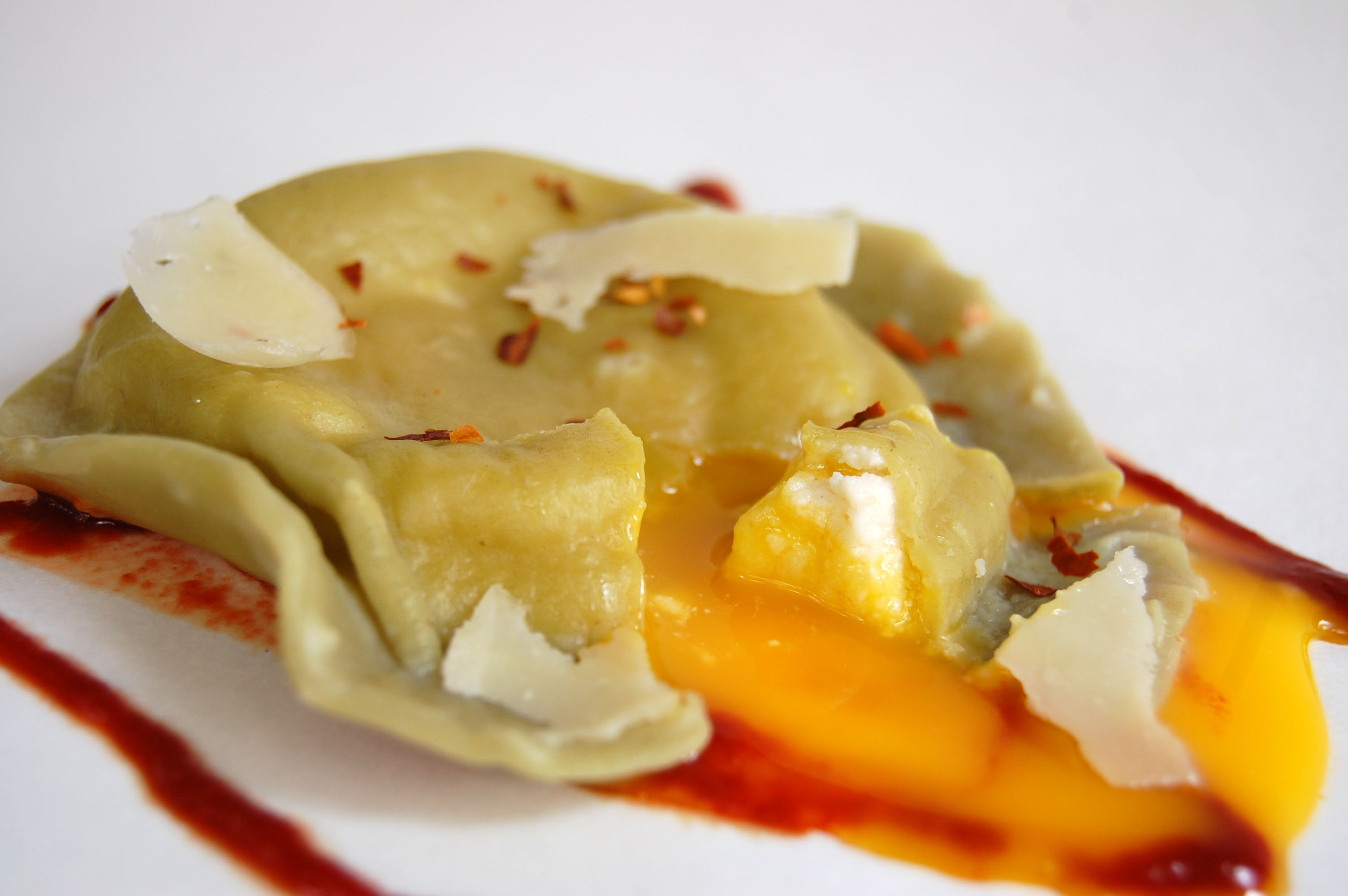 uova di raviolo simply means ‘egg in ravioli’ in italian. these are really big, so serve them one apiece as an appetizer or two apiece as an entrée. by dressing each one up with sriracha, red chile flakes, and shaved parmesan, the yolk gets to be the star of the show. however, these would be amazing served with a lemony pancetta sauce or even hollandaise (avocado benedict uova di raviolo??).