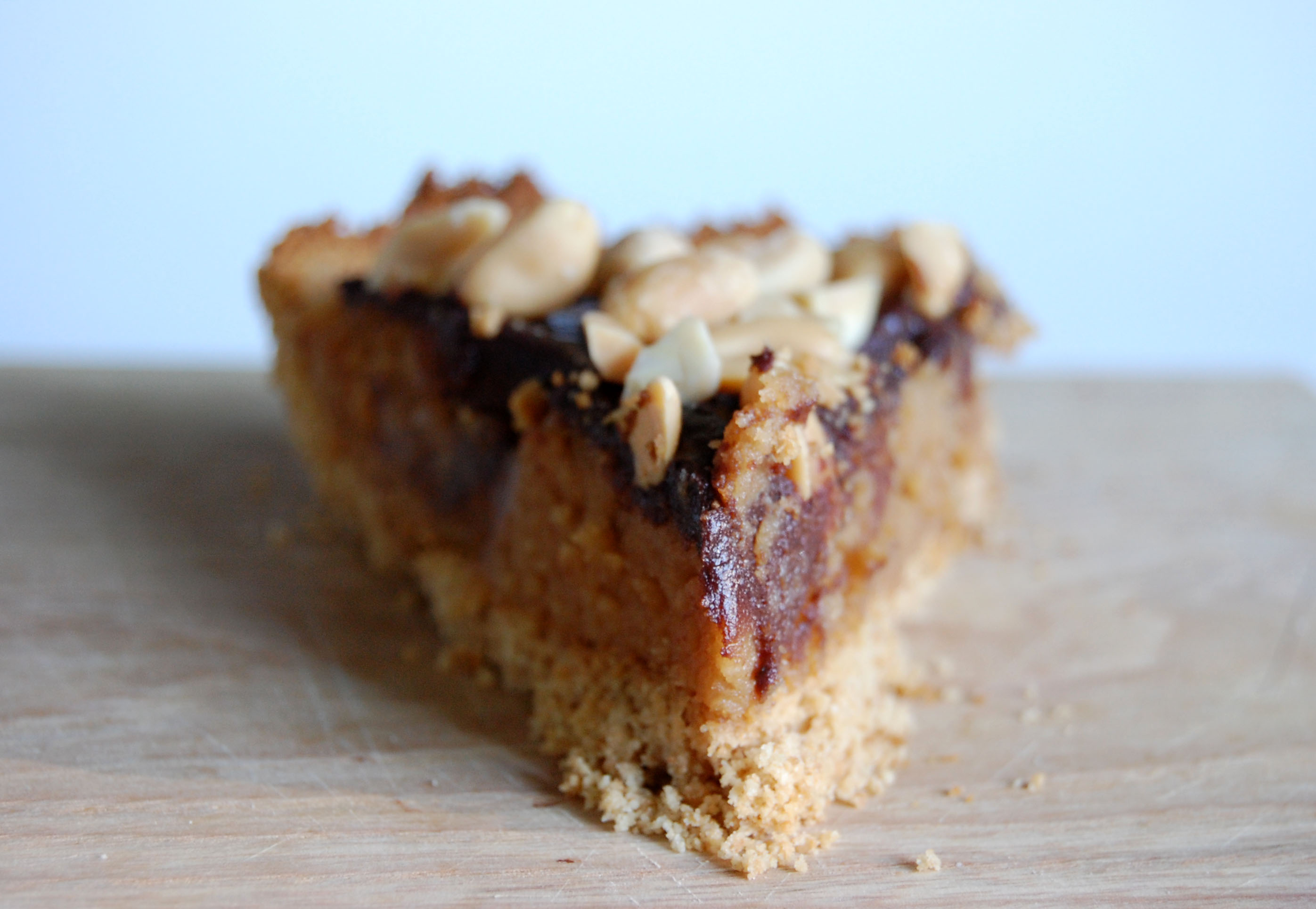 i’m happy with how it turned out, but there are definitely some modifications you can make to tailor to your tastes. if you’d prefer a lighter filling to balance out the dark ganache, try folding some whipped cream into the peanut butter mixture. stir in a few tablespoons of sugar in with the cocoa powder if you aren’t a bittersweet chocolate person. or try topping with marshmallows instead of nuts, and torch until charred.