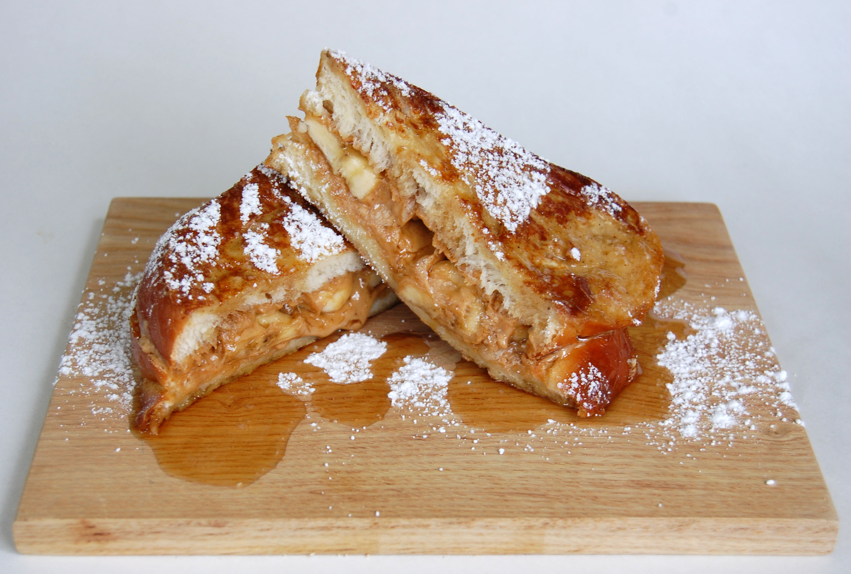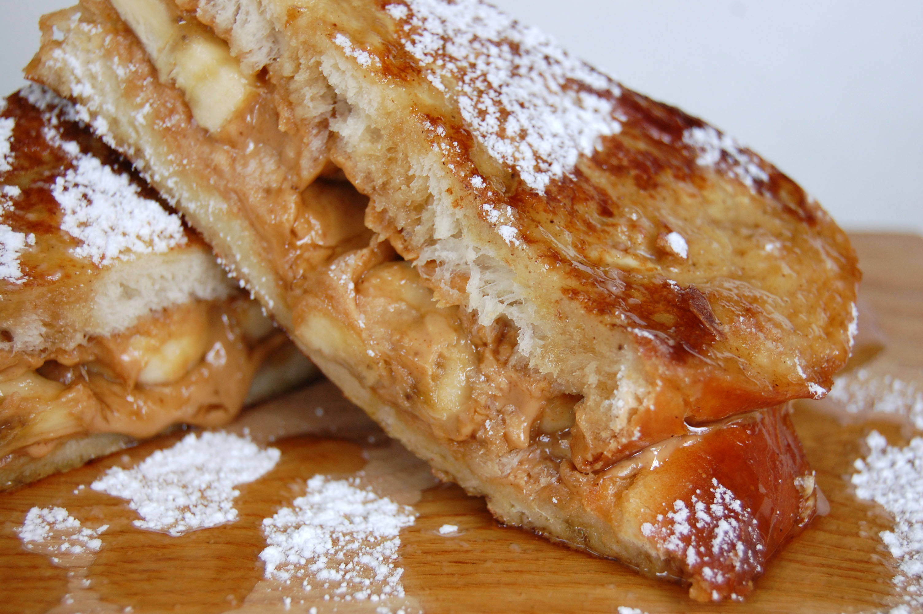 spread each slice of bread with about a tablespoon of peanut butter (or more). top two of the slices with the bananas, then drizzle with honey. stack the slices together to form two sandwiches. whisk together the eggs, cream, vanilla, nutmeg, rum, and salt in a shallow bowl. preheat an electric griddle to 375º, or heat a large skillet over medium-high heat. grease with butter or cooking spray. soak all sides of the sandwiches in the egg mixture, then place on the griddle or skillet. cook 3-4 minutes on each side, or until golden brown. remove to a cutting board and halve diagonally. serve with sifted powdered sugar and warm syrup.