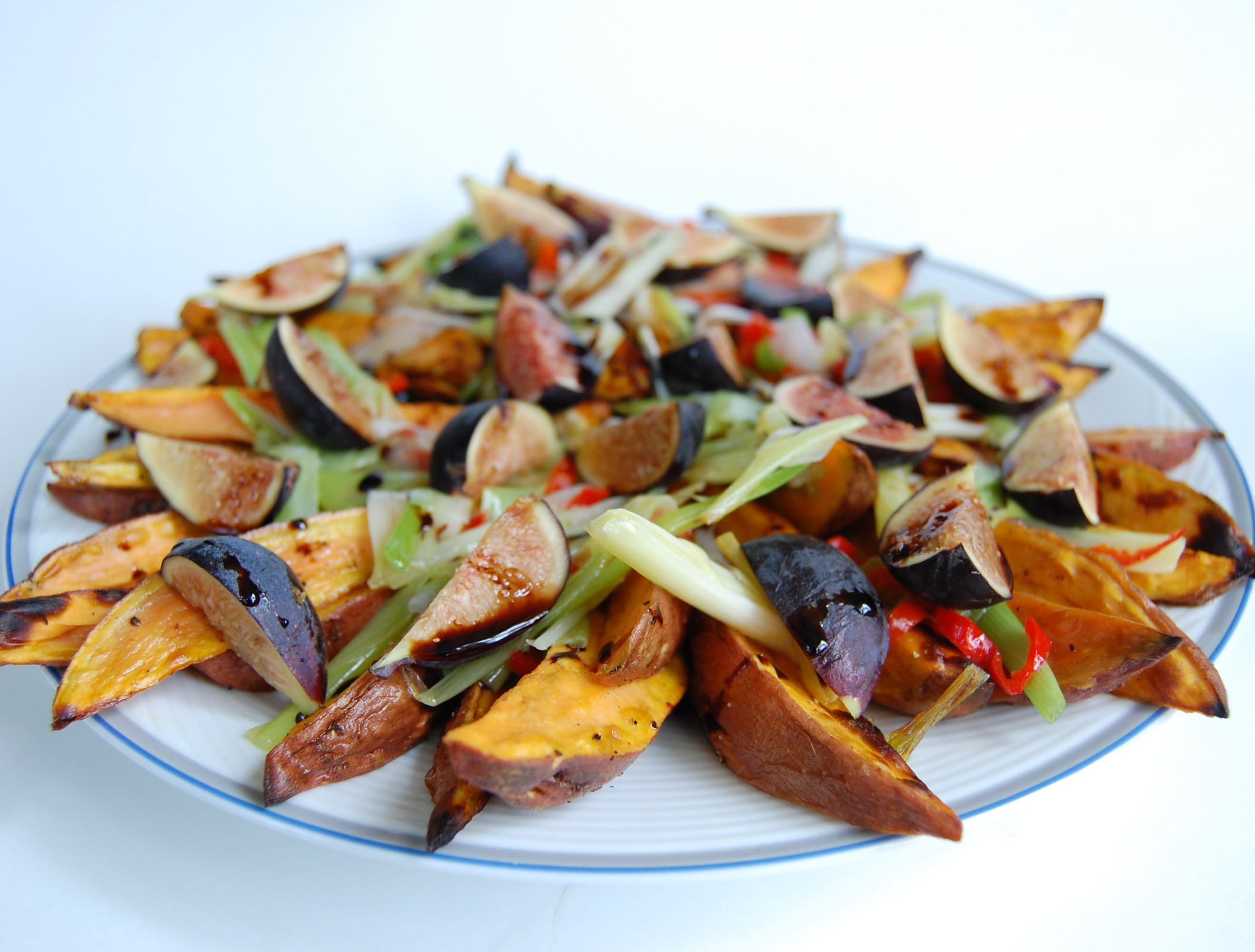 to serve, arrange the sweet potatoes on a large platter. heat the remaining oil in a saucepan and fry the green onions and chile for 4 minutes. spoon the oil, onions, and chile over the potatoes. dot with figs and drizzle with the balsamic reduction. crumble on the goat cheese. serve at room temperature.