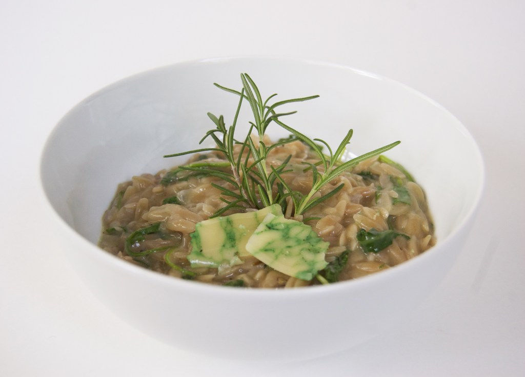 in a medium saucepan, warm the chicken broth over low heat. keep it on the heat but don’t let it get over a simmer. in a medium saucepan on a different burner, heat the olive oil over medium heat. add the shallow and sauté until translucent, about 3 minutes. season with salt and pepper, and add in the rosemary. dump in all of the orzo and toast for a minute, or until it smells nutty. slowly pour in the wine, stirring as you pour. continue to stir until all of the wine has been absorbed by the orzo. add a ladle of warm chicken broth to the orzo mixture, and stir until absorbed. continue this process, stirring constantly and adding ladles of chicken broth ever 4 to 5 minutes. this will take around 20 minutes. once all the broth is gone, the orzo should be pillowy and not at all al dente. it should lazily slop of the spoon when provoked. stir in the parmesan, butter, and sage derby until melted. serve in shallow white bowls, garnished with rosemary sprigs and shavings of sage derby. eat immediately!