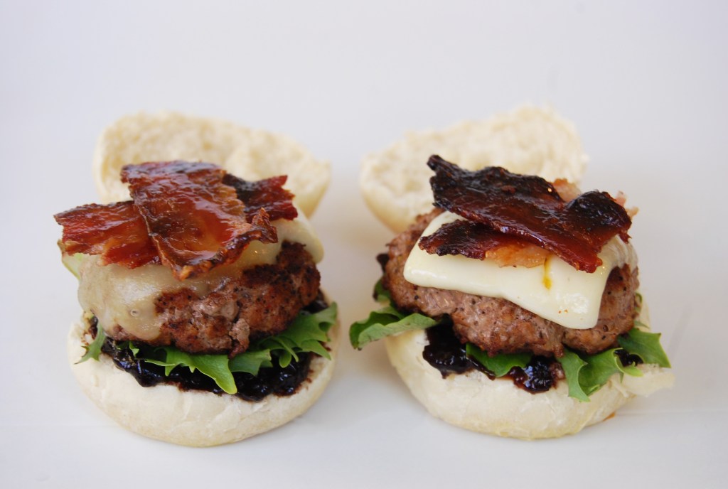 to assemble, slice the buns in half with a serrated knife. spread each side with butter, then toast on the grill or in a skillet. top each bottom bun with cherry jam, escarole, a burger patty, and a few pieces of bacon. sandwich with the top bun and enjoy!
